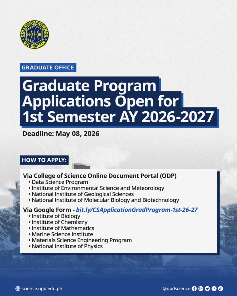 Applications to College of Science Graduate Programs for the 1st Semester of AY 2026-2027 are now open. Deadline for applications is on May 08, 2026.